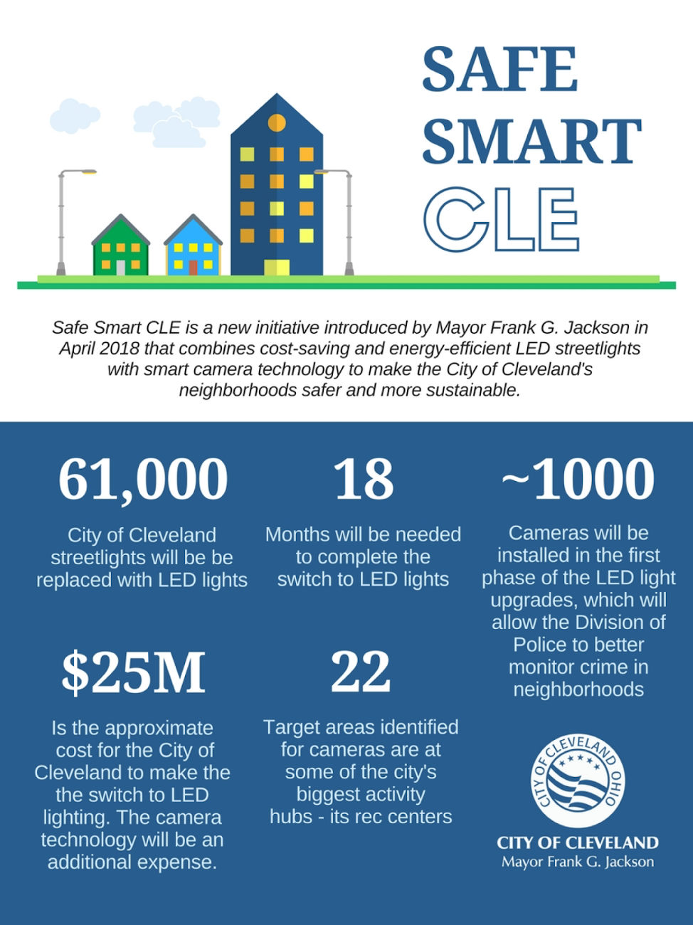 Safe Smart CLE is a new initiative introduced by Mayor Frank G. Jackson in April 2018 that combines cost-saving and energy-efficient LED streetlights with smart camera technology to make the City of Cleveland’s neighborhoods safer and more sustainable. The LED technology will be powered by Cleveland Public Power (CPP) and includes features like remote control to brighten or dim lights and alerts to CPP when there is a malfunction.